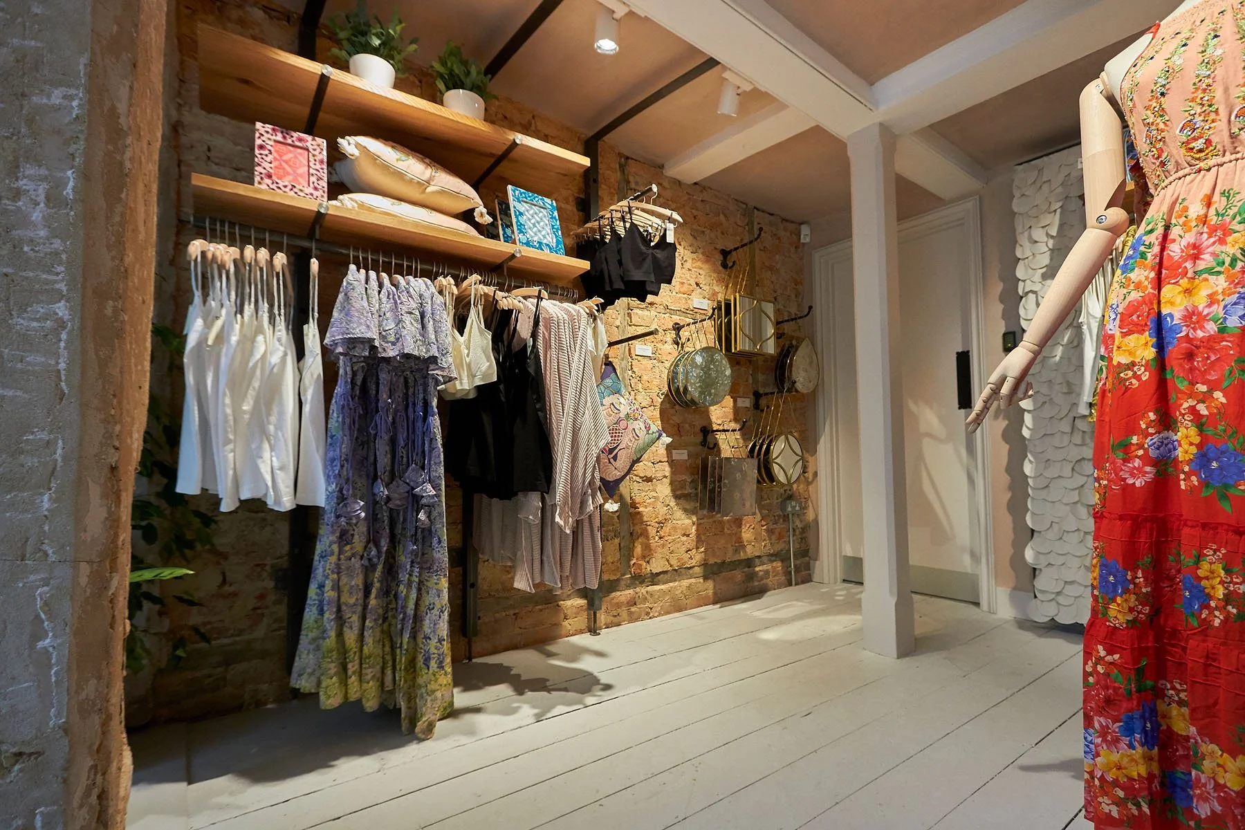 During our ‘strip back and restore’ process, we revealed an original stone facade to the spa lodge. This created an impactful arch entrance to a separate room, which we earmarked for selling loungewear. We also exposed some original Tudor brick work and Victorian timber floors, creating a textured and authentic feel to the space.