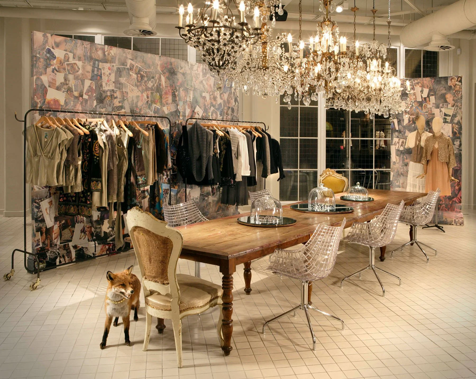 Each backdrop had elements relating the product being featured. It was designed purely to intrigue and delight. For ‘high fashion’, we designed a freestanding wall of magazine cuttings and juxtaposed this with a taxidermy fox and huge chandeliers. For ‘menswear,’ we created a leather suitcase table with hanging umbrellas converted into lights. In ‘media’, we installed 100s of light bulbs from the ceiling to create a canopy of light.